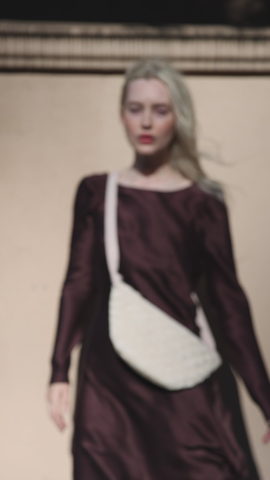 Its curved silhouette rests comfortably across the body, while the textured surface, formed through hours of handwork, brings quiet intricacy to any look.